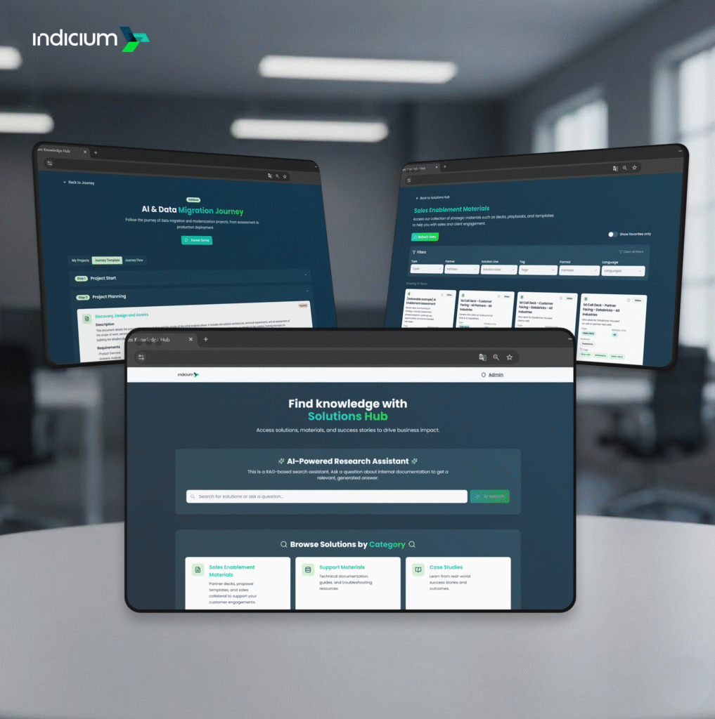 Our Solutions Hub shows how Indicium turned vibe coding into a go-to-market advantage. This was not another internal repository. We built it as a sales enablement product: a single place to consolidate, update, and operationalize what the company needs to sell with consistency, speed, and quality.